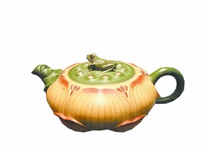 巧形。高建芳作品的凸起特点是不完全对称,不用工整的图案,外形精巧,具象和抽象相结合,加以夸张的手法,所以她的作品流露着浓重的大气味:西瓜壶枝叶逼真,果实与藤蔓相映成趣;枇杷壶构思巧妙,将把手用树枝的形态表现出来,苍劲有力,外形精巧;春鹃壶以花朵为盖,蕊柄顺延成钮,透露出春日融融、杜鹃灼灼的盎然气愤但愿;秋菊壶由一朵盛开的菊花勾画出清楚的轮廓,使人领略无限的秋韵;夏莲壶整个壶体就是一朵荷花包裹的莲蓬,小巧精致的彩蝶歇在莲芯上形成壶钮,颗颗莲子流动自如,一派“荷深水风阔,雨过清香发”的诗意画面。