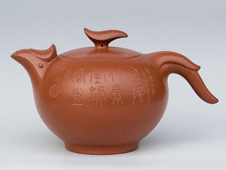 鸡头为嘴,以鸡冠点缀;鸡尾作把,振翅欲飞的鸡翅缩小作壶的子。壶身圆满,整体流畅协调,却不失重。纯净清水泥制作。
