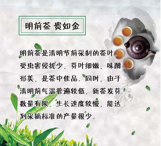 明前茶在清明前采摘,茶树发芽数量有限,能达到采摘的标准的产量很少,所以倍显珍贵。人们对“明前茶”的推崇,其实抽象概念大于实用价值,审美大于饮用价值,喝茶者的心态起了重要的作用。